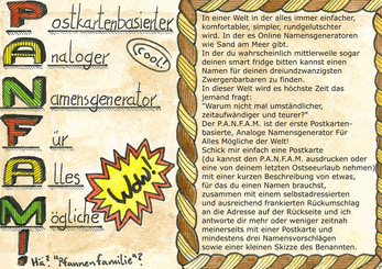 Der Postkartenbasierte, Analoge Namensgenerator Für Alles Mögliche zelebriert Umständlichkeit und entschleunigt eine Welt in der alles immer einfach und sofort verfügbar sein muss und ist auf keinen Fall ein perfider Trick um mal etwas anderes als Rechnungen und Flyer irgendwelcher Essenlieferservices in den Briefkasten zu bekommen.